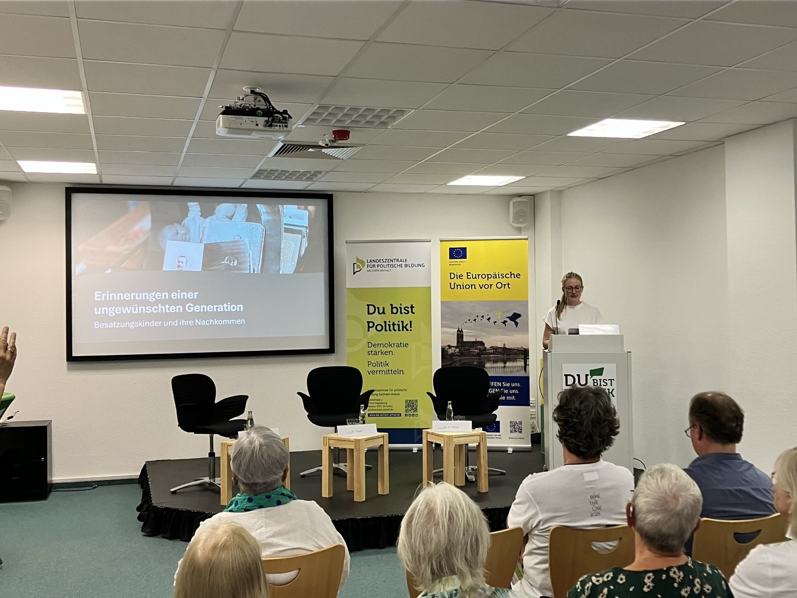 Im Rahmen des Erinnerungsjahres „80 Jahre Ende Zweiter Weltkrieg“ und der Aktion „Bike the Line“ organisierte das ED Magdeburg mit Unterstützung der Landeszentrale für politische Bildung am 7. Juli 2025 eine eindrucksvolle Lesung mit anschließendem Gespräch. Unter dem Titel „Erinnerungen einer ungewünschten Generation – Besatzungskinder und ihre Nachkommen auf der Suche nach den eigenen Wurzeln“ berichtete die Autorin Dr. Sophie Hubbe aus ihrem gleichnamigen Buch, das am 11. August im Buchhandel erscheinen wird. Die Veranstaltung gab berührende Einblicke in eine lange verdrängte Geschichte der Nachkriegszeit und deren Folgen bis in die Gegenwart. Im Gespräch mit Herrn Matthias Teske, Enkel eines Besatzungskindes, wurde deutlich, wie prägend das Schweigen in den Familien war und wie wichtig die heutige Auseinandersetzung für die persönliche Identität ist. Die Veranstaltung zeigte eindrucksvoll, wie Erinnerungskultur in der Gegenwart wirken kann und welche Verantwortung auch kommende Generationen tragen. Das interessierte Publikum beteiligte sich rege an Fragen und Diskussionen. Die Landeszentrale betonte den Wert solcher Veranstaltungen für die politische Bildung, die historische Aufarbeitung und das Zusammenwachsen Europas durch grenzüberschreitende Versöhnung – auch 80 Jahre nach dem Ende des Zweiten Weltkriegs.
