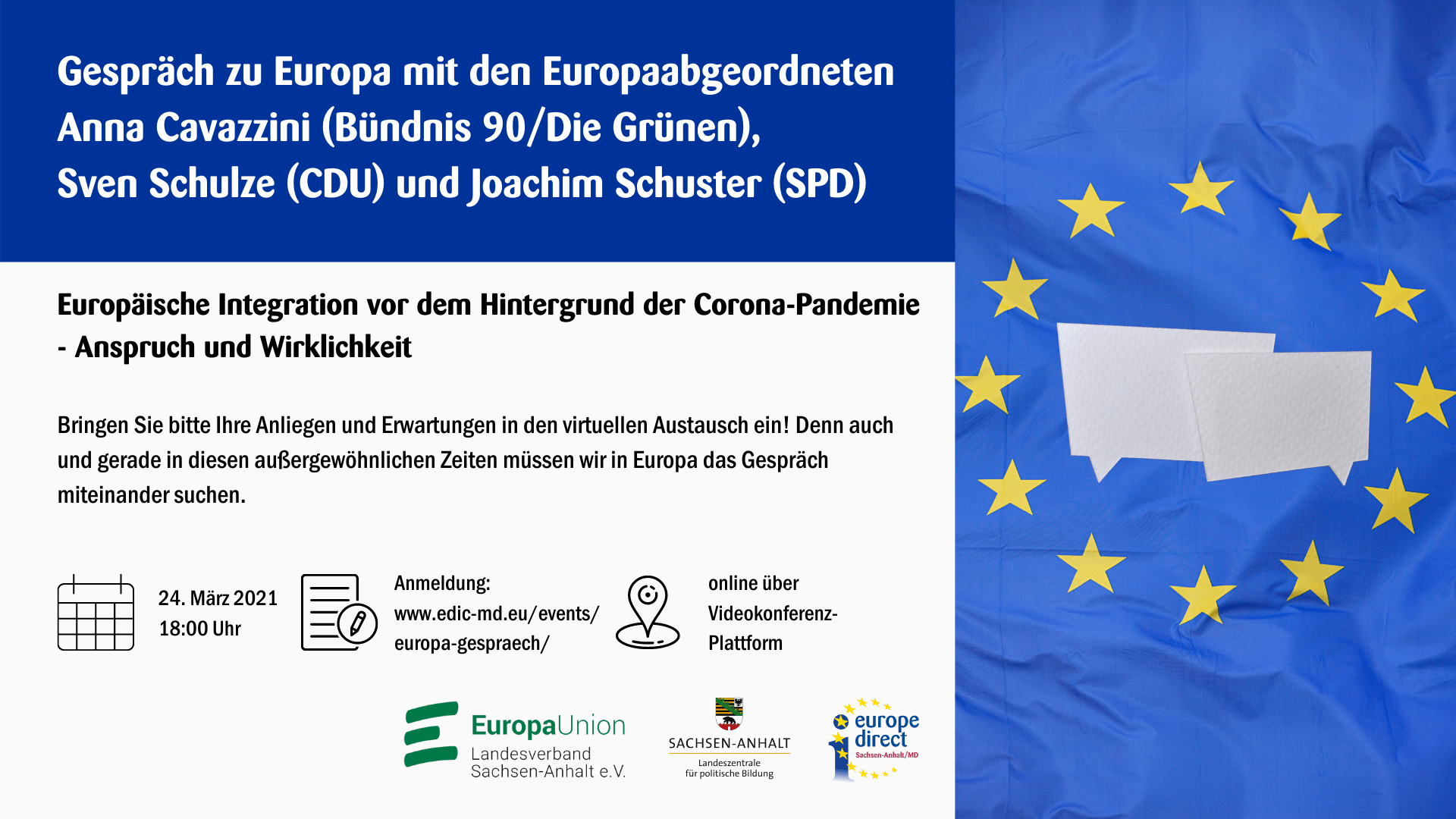 Wir, die überparteiliche Europa-Union Deutschland, Landesverband Sachsen-Anhalt, und das EUROPE DIRECT Informationszentrum (EDIC) Sachsen-Anhalt/Magdeburg laden Sie daher für den 24. März 2021 um 18:00 Uhr herzlich ein zu unserem interaktiven Gespräch zu Europa mit den Europaabgeordneten Anna Cavazzini (Bündnis 90/Die Grünen), Sven Schulze (CDU) und Joachim Schuster (SPD).